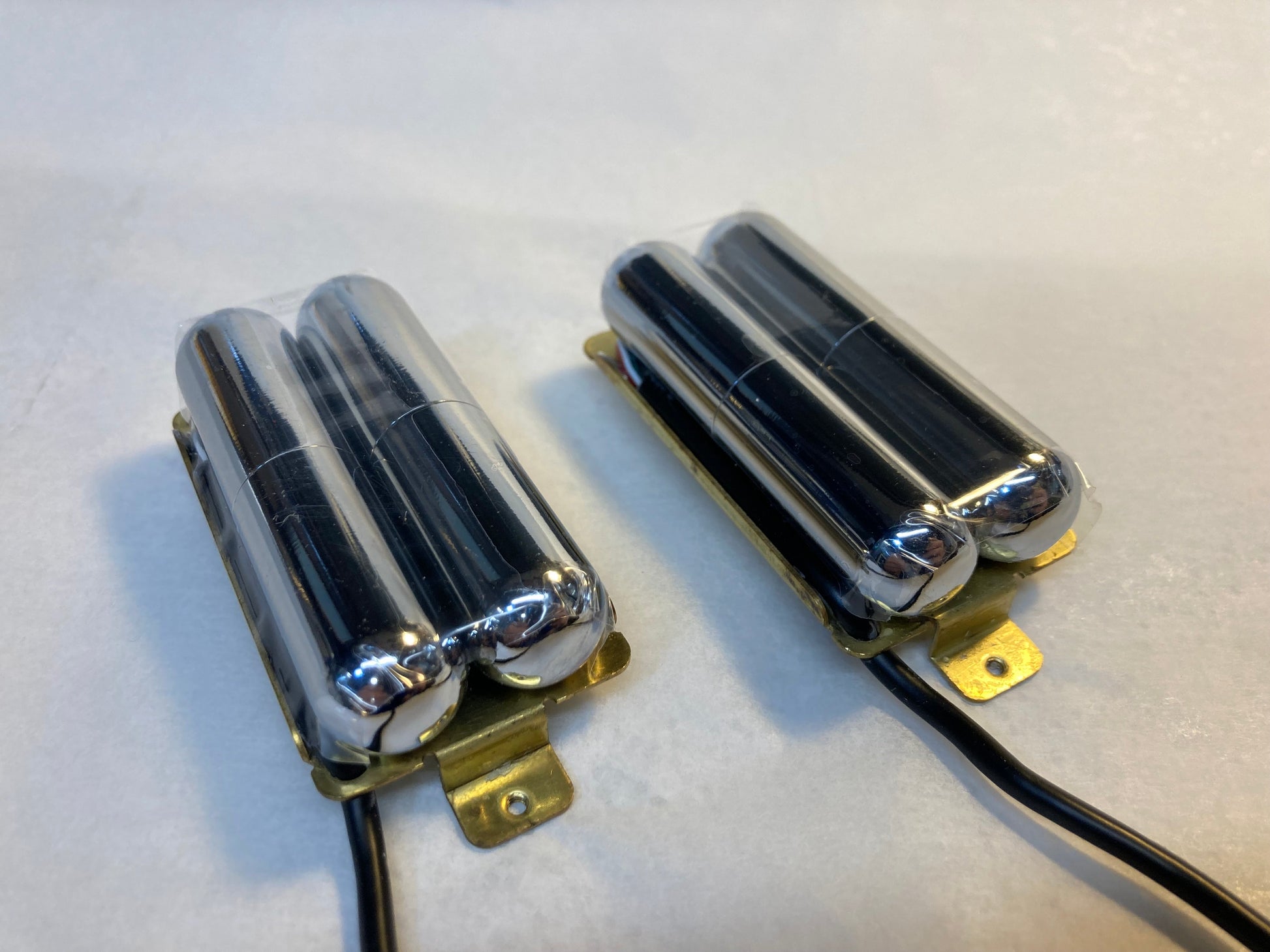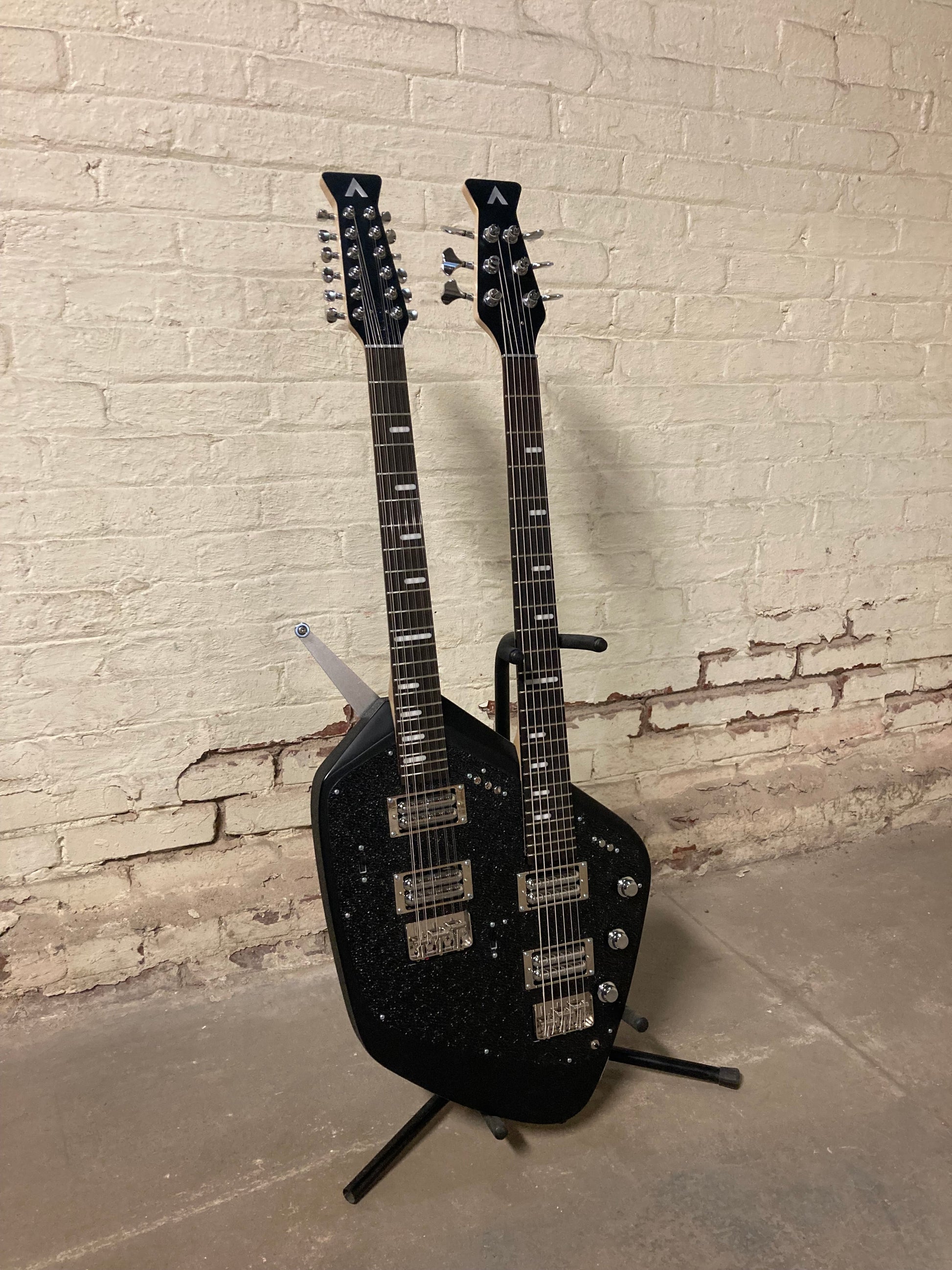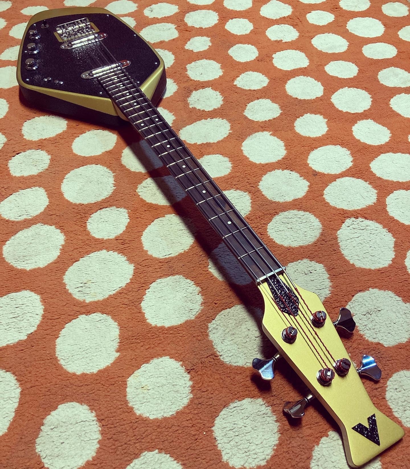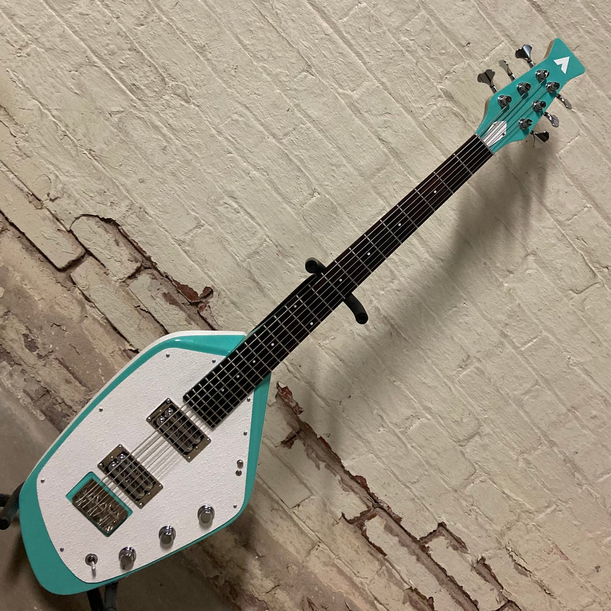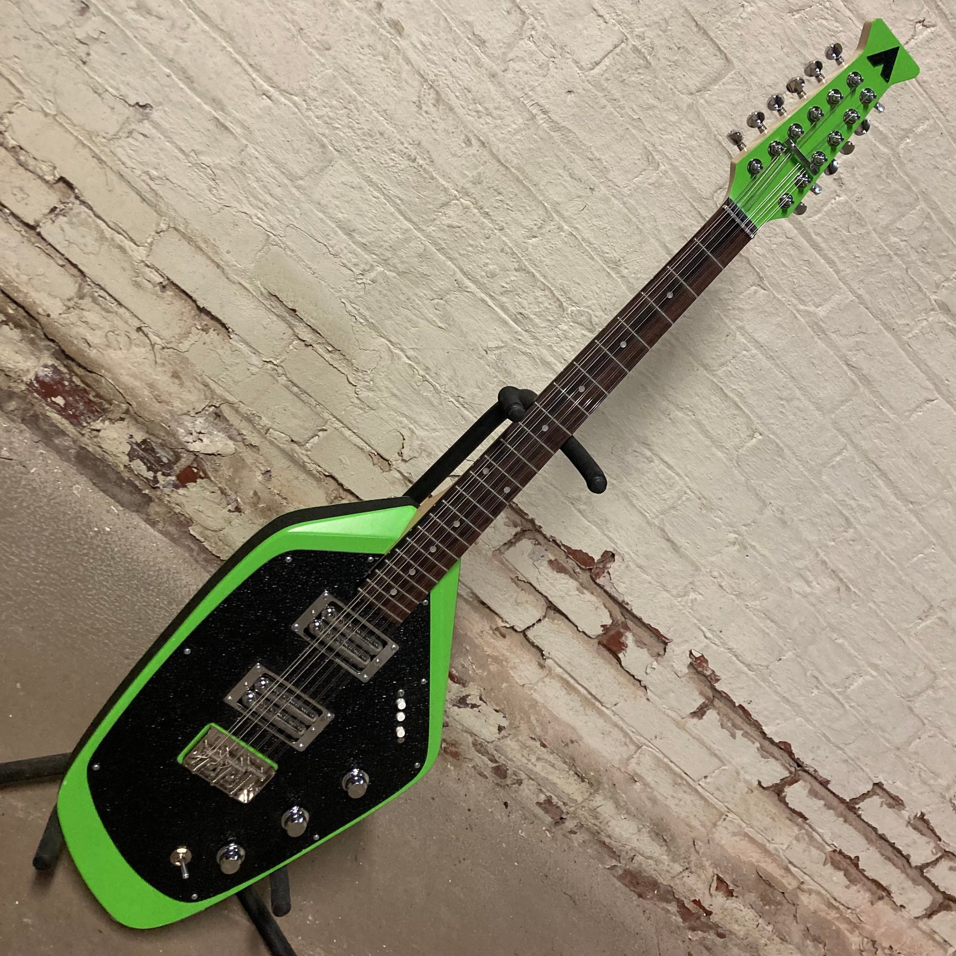 the electrical package includes two duel Anico 5 lipstick humbuckers. The chrome push buttons in the pickguard act as a master coil split on all variants of the Dantom. All variants also include a master volume and pickup selector. 6 string guitar versions have 2 “tone” knobs while bass and 12 string versions have a two band passive EQ.
